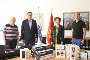 (c) Dominique Waag, Head of the OSCE Mission to Montenegro, and Milan Marković, Dean of the Faculty of Political Science, together with Nataša Ružić, Head of Faculty's Department for Media Studies and Journalism, and Evan Eberle, Mission's Media Programme Manager, on the occasion of Mission's hand-over of mobile journalism equipment, Podgorica, 28 October 2022.