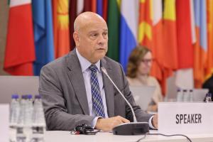Thomas E. Garrett, Secretary General of the Community of Democracies, speaks at the closing session of the Warsaw Human Dimension Conference. 7 October 2022.