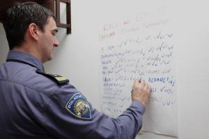 A police officer participates in an exercise on exploring the different types of diversity within his community. As well as working with law enforcement officers, the TAHCLE programme actively engages with civil society in order to learn about their perceptions on how hate crimes impact their communities and how appropriately police respond to community needs. Zagreb, 23 March 2012.