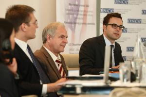 R-l: Mato Meyer, OSCE Mission to Serbia; Milan Bojkovic, Deputy Public Prosecutor and Aleksandar Vujicic, Director of the Anti-Money Laundering Directorate give introductory speeches at a workshop on money laundering investigations, Zrenjanin, 23 March 2012.