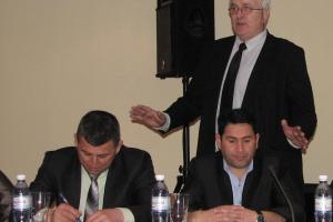 Dragomir Trninic, the Head of Interior Ministry's Department on Suppression of Organized Financial Crime; Roar Larsen, the Head of the OSCE Mission to Serbia's Law Enforcement Department, and Tristam Hicks from the Bramshill Police College (UK), during a presentation on specialized police training courses. The event was organized jointly by the OSCE Mission to Serbia and the Serbian Interior Ministry, Belgrade, 2 February 2012.