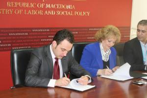 Deputy Head of OSCE Mission to Skopje, Ambassador Natalya Drozd (r) and Minister of Labour and Social Policy Spiro Ristovski signing a Memorandum of Understanding supporting the inclusion of Roma children in public pre-school institutions, Skopje, 1 March 2012.
