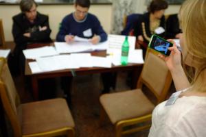 A domestic election observation films the work of the election commission at a polling station in Moscow during Russia's Presidential election, 4 March 2012.