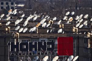 Satellite dishes on the rooftops of Dushanbe, Tajikistan.