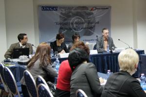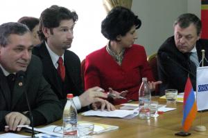 L-r: Filaret Berikyan, Chairperson of the Inter-Institutional Commission for Combating Gender-based Violence, Deputy Minister of Social and labour issues; Oliver McCoy, OSCE Yerevan Office Democratization Programme Manager; Shoghik Sargsyan from the OSCE Office in Yerevan and Lilian Salaru, OSCE Yerevan Office Politico-Military Programme Manager, Yerevan, 17 February 2012.