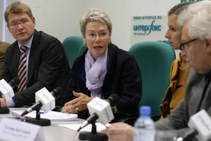 Ambassador Heidi Tagliavini (c), the head of the OSCE/ODIHR Election Observation Mission for the 4 March 2012 presidential election in the Russian Federation, announced the opening of the Mission at a press conference in Moscow, 26 January 2012.