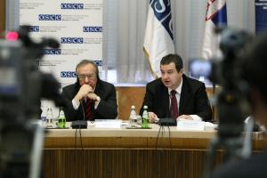 (l-r) Head of the OSCE Mission to Serbia, Ambassador Kypreos, and Interior Minister Ivica Dacic present the findings of the 2011 annual public opinion poll on citizens' attitudes towards the police in Serbia, Belgrade, 26 January 2012.