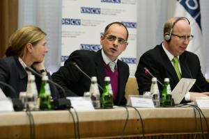 L-r: OSCE Mission to Serbia Rule of Law and Human Rights Department Head Ruth van Rhijn, Marko Blagojevic, Director of the NGO Centre for Free Elections and Democracy, and Roar Larsen, Head of Mission's Law Enforcement Department, present the results of the 2011 annual public opinion poll on citizens' attitudes towards the police in Serbia, commissioned by the OSCE Mission to Serbia and the Interior Ministry, Belgrade, 26 January 2012.