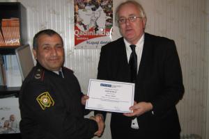 Hans Inge Jorstad, Rule of Law Officer at the OSCE Office in Baku (r), presents a certificate to a participant who completed the training course for police and penitentiary officers on international standards related to the treatment of suspects and accused in custody, Ganja, 13 December 2011.