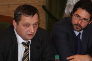 Anatoliy Martsynkevych (l), Secretary of the Higher Qualification Commission of Judges of Ukraine, and Benjamin Moreau, Chief of ODIHR’s Rule of Law Unit at a conference on identifying ways to strengthen the independence of Ukraine's judiciary, Kyiv, 20 December 2011.