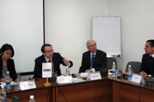 L-r: Deputy Minister of Foreign Affairs of Kyrgyzstan Dinara Kemelova, Director of the OSCE Academy Maxim Ryabkov, the Head of the OSCE Centre in Bishkek Ambassador Andrew Tesoriere and Ambassador of France in Kyrgyzstan Thibaut Fourriere, Bishkek, 19 December 2011.