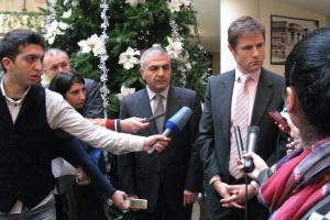 Carel Hofstra, Acting Head of the OSCE Office in Yerevan (r), and General Major Hunan Poghosyan, the 1st Deputy Head of RA Police answer questions from media representatives at a cyber security conference organized by the OSCE Office in Yerevan and the Armenian Police, Yerevan, 8 December 2011.
