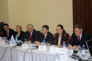 L-r: Radoslav Rzehak, Deputy Representative of the Children's Fund (UNICEF) in Kazakhstan; Silvia Pogolsa, Project Co-ordinator, OSCE Centre in Astana; Vyacheslav Kalyuzhnyy, Head of Office of the National Centre for Human Rights; Ambassador Askar Shakirov, High Commissioner for Human Rights of Kazakhstan; Jeannette Kloetzer, Acting Head of the OSCE Centre in Astana; and Ambassador Rokas Bernotas, Embassy of Lithuania in Kazakhstan, during the final roundtable discussion of a project on supporting the National Commissioner for Human Rights (Ombudsman) in Kazakhstan, Astana, 11 November 2011.