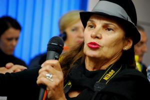 A journalist posing questions at a press conference for the launch of the Orthodox Graveyards Catalogue, published by the Mission, Caglavica/Caglavice, 26 October 2011.