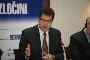 Ambassador Janez Lenarčič, the Director of the OSCE Office for Democratic Institutions and Human Rights, speaks at an event marking the conclusion of the 18-month War Crimes Justice Project (WCJP), Sarajevo, 26 October 2011.
