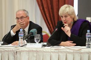 The OSCE Representative on Freedom of the Media, Dunja Mijatović (r), speaking during her first official visit to Skopje, alongside the Head of the OSCE Mission to Skopje, Ralf Breth, Skopje, 27 October 2011.