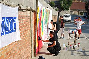 Artists in Rahovec/Orahovac create a graffiti work at an event organized by the OSCE Mission in Kosovo to mark International Democracy Day on 15 September 2010. The Mission ran 35 local events under the slogan "Accept the Challenge of Democracy!"