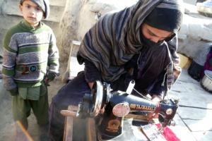 A women entrepreneur from Nangarhar Province, Afghanistan, prepares garments for sale, 29 May 2010.
