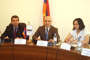 Ambassador Sergey Kapinos, Head of the OSCE Office in Yerevan (c) and Artak Shaboyan, Chairman of Armenia's State Commission on Economic Competition, at the signing of an agreement on co-operation to foster economic competition, Yerevan, 2 June 2010.