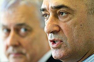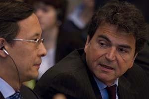 French Minister of State for European Affairs Pierre Lellouche (r) with Kazakh Ambassador Kairat Abdrakhmanov at the OSCE Permanent Council, Vienna, 20 May 2010.