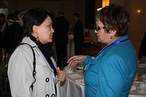 Aigul Solovyeva (r), member of Kazakhstan's parliament, and Zhanar Mendebayeva (l), country representative for USAID's Local Development Initiative, discuss local self-government issues at a conference organized by the OSCE Centre in Astana, 21 May 2010.