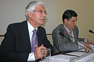 Ambassador Ivar Vikki (l), Head of the OSCE Office in Tajikistan, addresses participants at the first meeting of the Co-ordination Council on Free Economic Zones in Dushanbe, 27 April 2010.