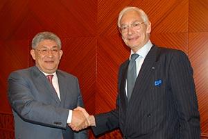Ambassador Alexandre Keltchewsky (r), Head of the OSCE Centre in Astana, meets with Krymbek Kusherbayev (l), Akim (mayor) of Mangystau Oblast in Aktau, Kazakhstan, 27 April 2010.
