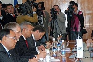 The OSCE Chairperson-in-Office, Kazakhstan's Secretary of State and Foreign Minister, Kanat Saudabayev (left) at a press conference in Bishkek, 20 April 2010.