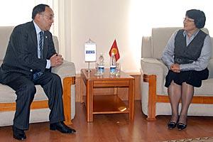 The Chairperson of the OSCE Permanent Council, Ambassador Kairat Abdrakhmanov, and United Nations Secretary-General Ban Ki-Moon discuss at a meeting of the OSCE Permanent Council. Vienna, 8 April 2010.