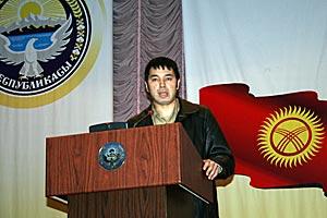 Nurbek Toktakunov, chair of the body of civil control on Bishkek, addresses a meeting on rebuilding confidence between civil society and the police, Bishkek, 22 April 2010.