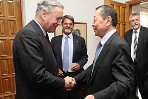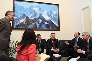 The Special Envoy of the OSCE Chairperson-in-Office Zhanybek Karibzhanov (r) meets EU Special Representative for Central Asia Pierre Morel (l), in Bishkek, 11 April 2010. Looking on is the German Ambassador in Kyrgyzstan, Holger Gren (c).