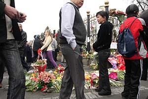 People walk past flowers laid in tribute to those killed in the violence outside the gates of the White House in Bishkek, 11 April 2010.