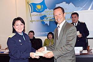 OSCE Human Dimension Officer Stefan Buchmayer awards certificates to prosecutors at the conclusion of a seminar on jury trials in Astana, 13 April 2010.