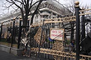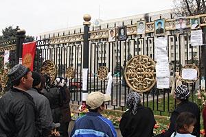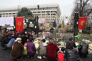 People pray for those killed in the violence outside the gates of the White House in Bishkek, 11 April 2010. The placard in red on the gates reads "Death to the Bakiev family and Daniyar Usenov" [the former Kyrgyz Prime Minister].
