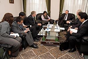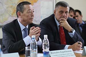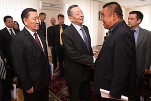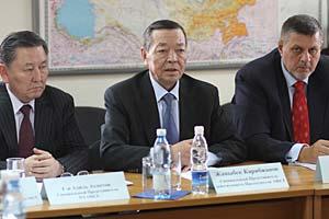Special Envoy of the OSCE Chairperson-in-Office, Zhanybek Karibzhanov (c), meets Acting Kyrgyz Interior Minister Bolot Sherniyazov (r), Bishkek, 10 April 2010. On the left is OSCE Parliamentary Assembly Special Envoy, Adil Akhmetov.