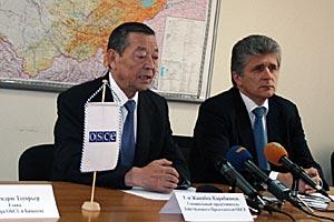 Zhanybek Karibzhanov, Special Envoy of the OSCE Chairperson-in-Office, is interviewed by the media in Bishkek, 9 April 2010. On the left is interim Kyrgyz Deputy Foreign Minister Nurlan Aytmurzaev.