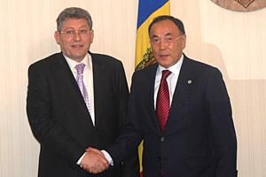 The OSCE Chairperson-in-Office, Kazakhstan's Secretary of State and Foreign Minister, Kanat Saudabayev with Moldova's Acting President and Parliamentary Speaker Mihai Ghimpu, Chisinau, 1 April 2010.