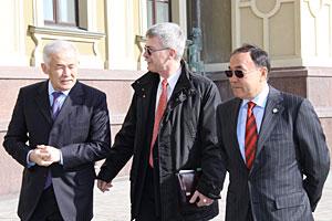 The OSCE Chairperson-in-Office, Kazakhstan's Secretary of State and Foreign Minister, Kanat Saudabayev (r), with the Kazakh Amb. to Ukraine Amangeldi Zhumambaev (l), and the OSCE Project Co-ordinator in Ukraine, Amb. Lubomir Kopaj, in Kyiv, 31 March 2010.