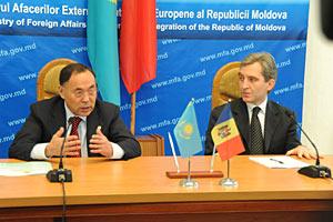 The OSCE Chairperson-in-Office, Kazakhstan's Secretary of State and Foreign Minister, Kanat Saudabayev at a press conference with Moldova's Deputy Prime Minister, Minister of Foreign Affairs and European Integration, Iurie Leanca, Chisinau, 1 April 2010.