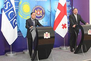 The OSCE Chairperson-in-Office, Kazakhstan's Secretary of State and Foreign Minister, Kanat Saudabayev (l), and Georgia's Foreign Minister Gregory Vashadze speak to the media after meeting in Tbilisi, 17 February 2010.