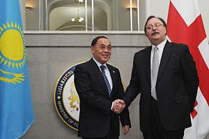 The OSCE Chairperson-in-Office, Kazakhstan's Secretary of State and Foreign Minister, Kanat Saudabayev (l), meets Georgia's Foreign Minister Gregory Vashadze at the Ministry of Foreign Affairs in Tbilisi, 17 February 2010.