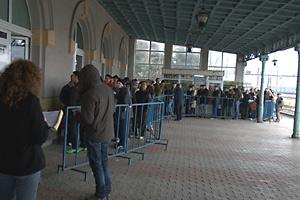 Voters stand in line in front of a special polling station at a train station in Bucharest during the second round of the Romanian presidential elections, 6 December 2009