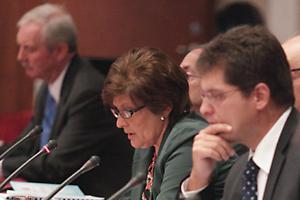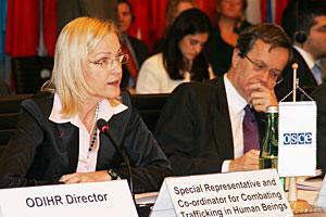 OSCE Special Representative for Combating Trafficking in Human Beings Eva Biaudet (l), speaking at the OSCE Permanent Council with OSCE Secretary General Marc Perrin de Brichambaut, Vienna, 10 December 2009.