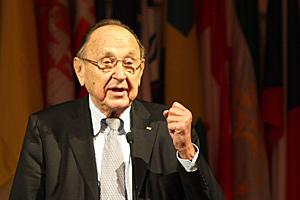 Former German Foreign Minister Hans-Dietrich Genscher delivers a speech at an OSCE event in Vienna to mark the anniversary of the fall of the Berlin Wall, 6 Nov 2009.