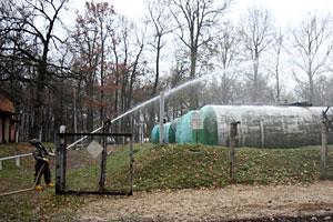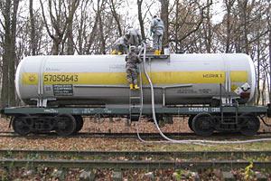 Ukrainian military personnel in protective suits during an exercise held as part of an OSCE project that will help Ukraine safely dispose of thousands of tonnes of the toxic rocket fuel component melange. Kalynivka, Vinnytsya region. 18 November 2009.