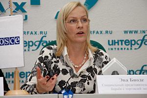 Eva Biaudet, the OSCE Special Representative for Combating Trafficking in Human Beings, speaks to the media during a trip to Moscow to discuss international co-operation in combating trafficking, 20 November 2009.