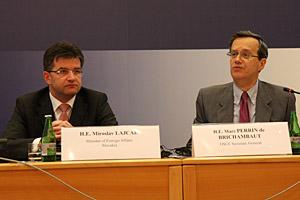 Slovak Foreign Minister Miroslav Lajcak (l) listens as OSCE Secretary General, Marc Perrin de Brichambaut, delivers a speech during the opening session of a conference on strengthening energy security in the OSCE area, Bratislava, 6 July 2009.