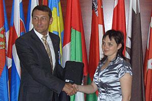 OSCE Border Issues Adviser Johann Wagner (l) presents a kit for identifying forged documents to the Chief of the Teryuha cross-border checkpoint, Alesia Nikolaevna Zigankova, as part of a two-week training course, Minsk, 6 July 2009.