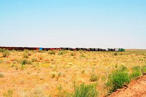 A train passes through the desert in Turkmenistan, 4 July 2009.