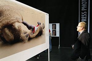 Ambassador Hans Ola Urstad, Head of OSCE Mission to Serbia, looks at one of the photos after the opening of the World Press Photo Exhibition in Belgrade, event set up with the Mission's support, 17 May 2009